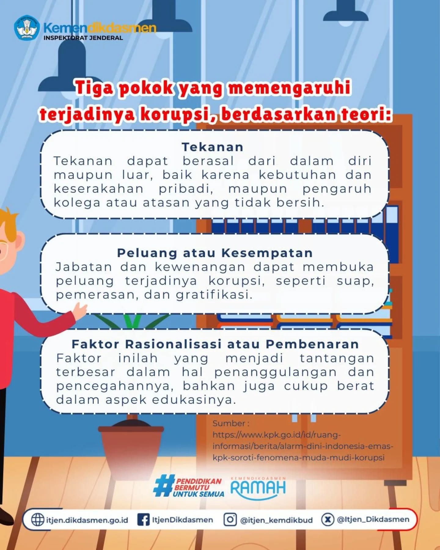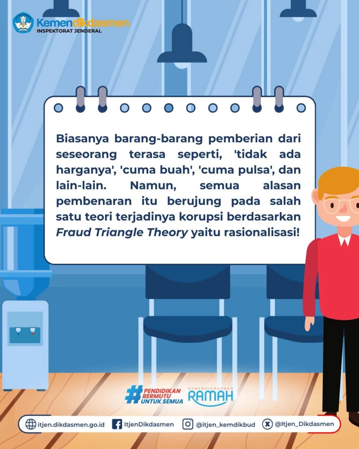 Gratifikasi tidak hanya tentang besarnya, tetapi juga dampaknya. Semua bisa jadi celah awal korupsi! Jangan biarkan tekanan, peluang, dan rasionalisasi menggoyahkan integritasmu. Integritas bukan tentang nilai barang, tapi bagaimana kita menolak segala bentuk pembenaran. Mulai dari diri sendiri, tolak gratifikasi, jaga kejujuran!